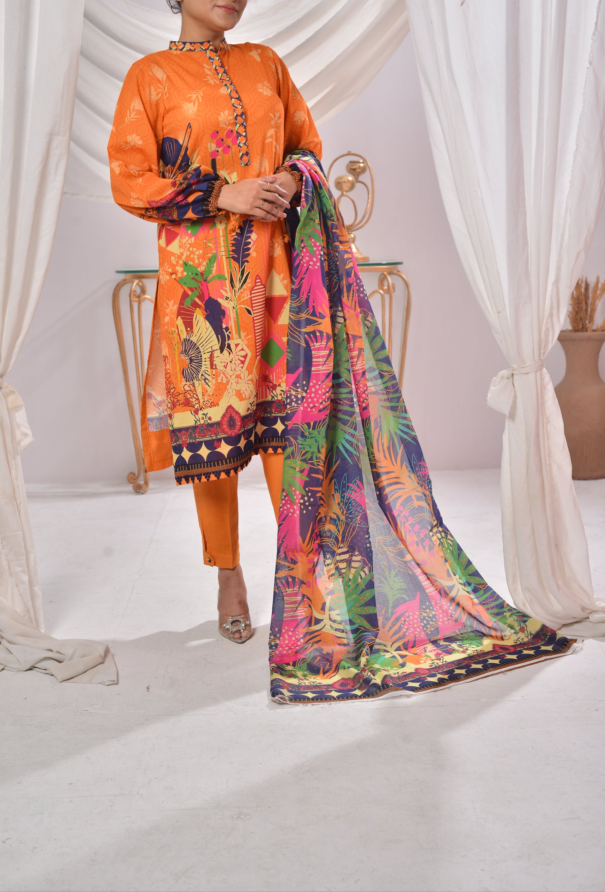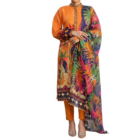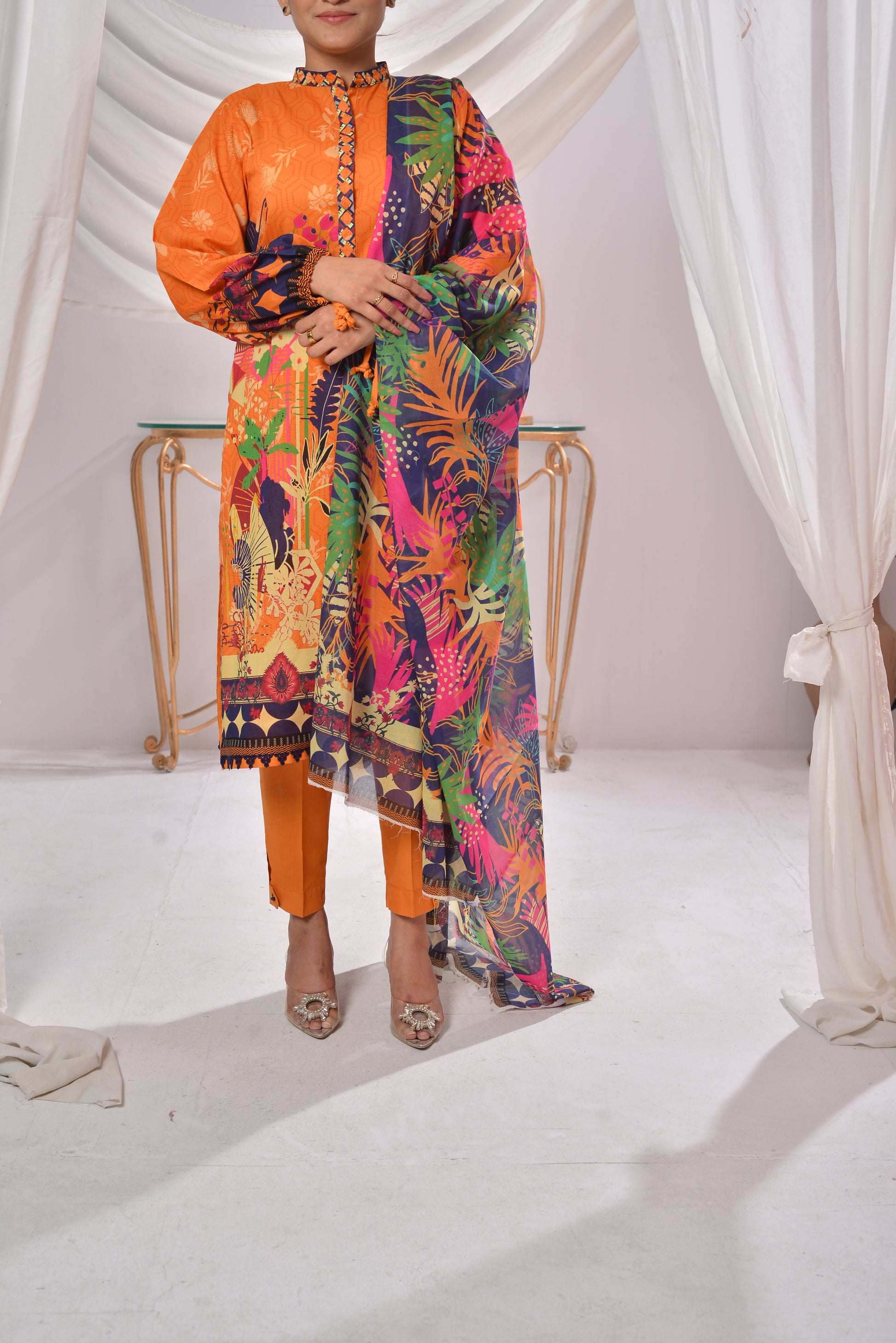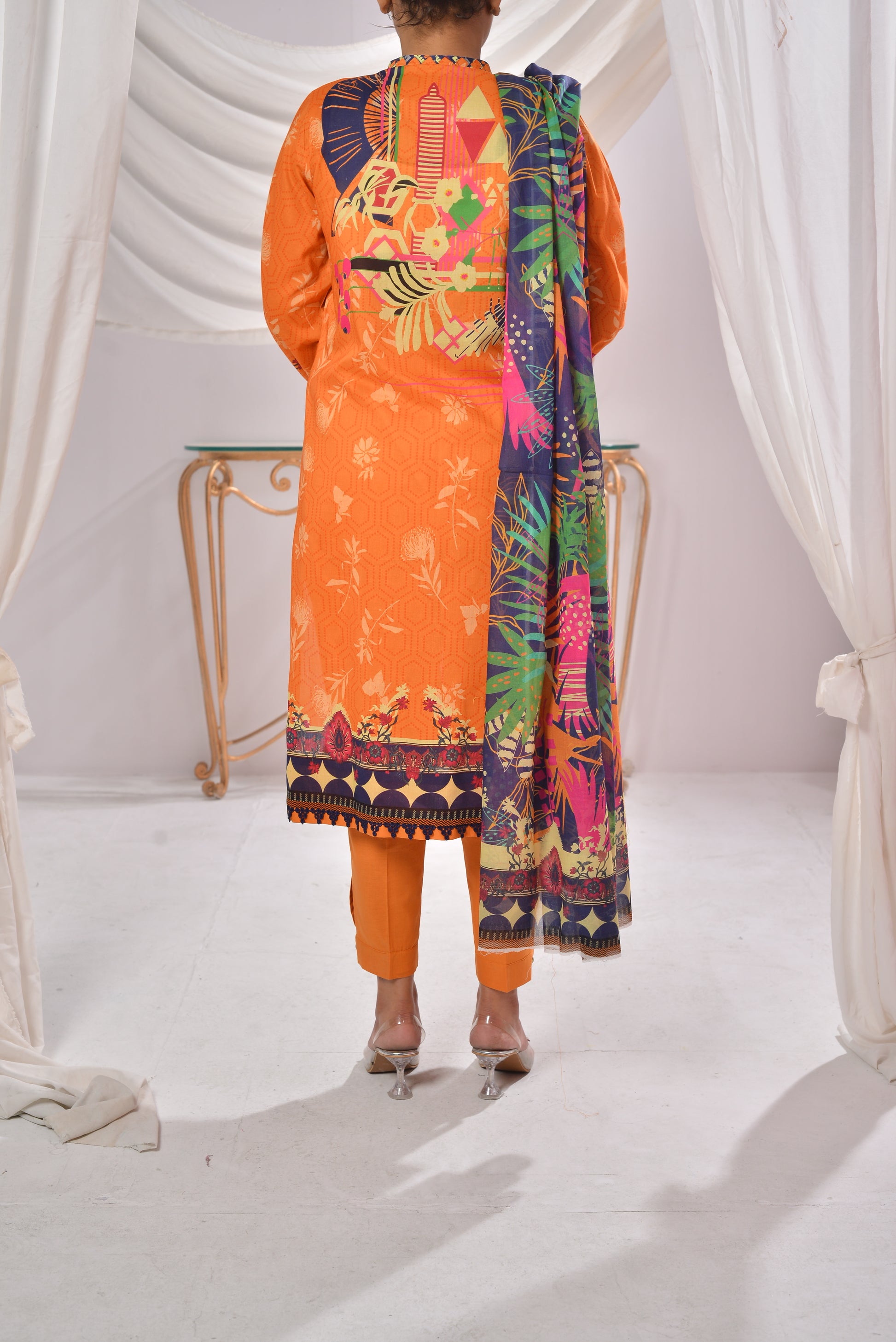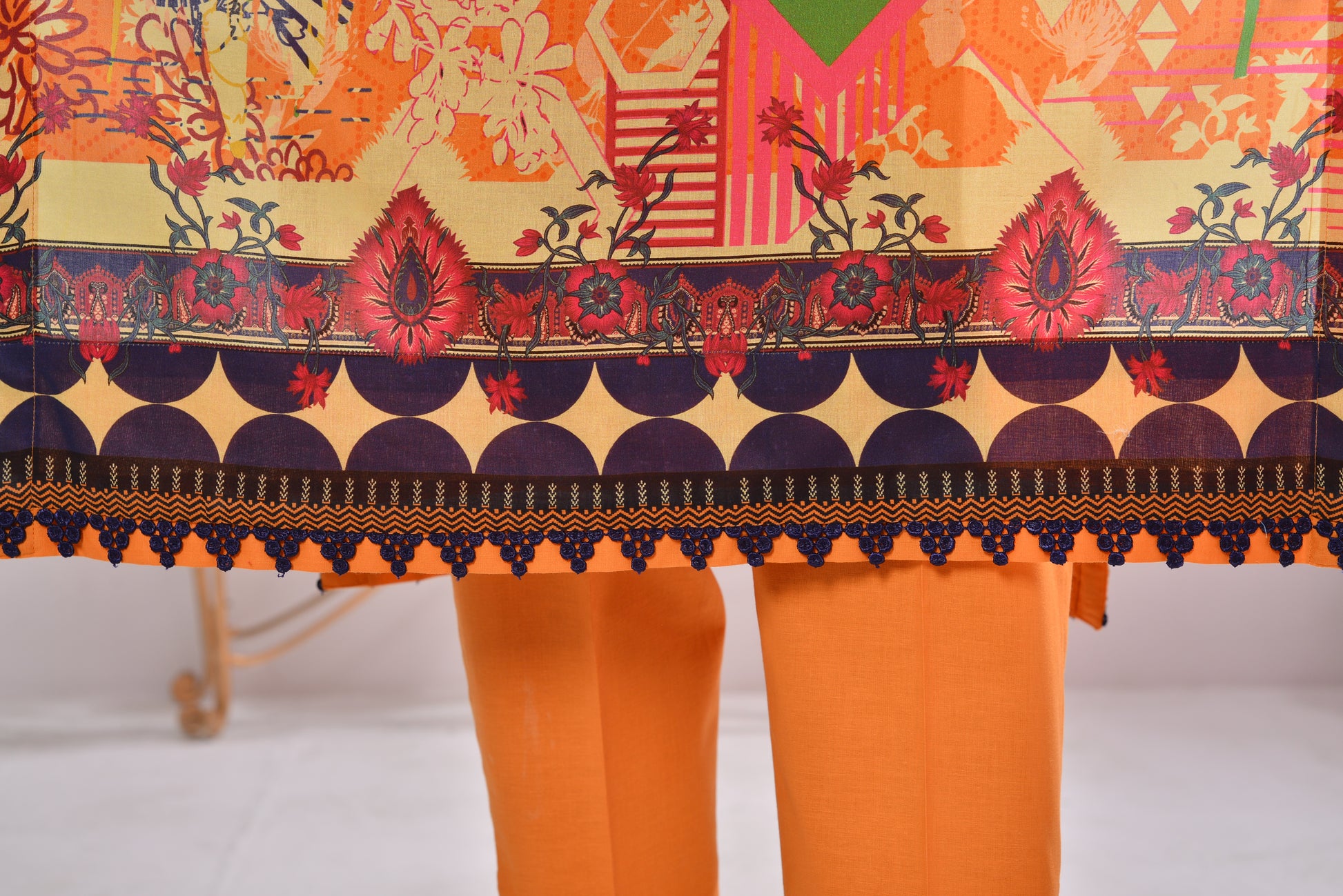 Orange and yellow suit, Printed lawn suit, Women's suit, Premium quality, Budget friendly, Eye-catching patterns, Detailed design, Casual outings, Special occasions, Matching pants, Effortlessly chic, Modern traditional look, Bright colors, Two-piece set, Pakistani fashion, Eastern wear, Karachi fashion, Lawn fabric, Summer wear.