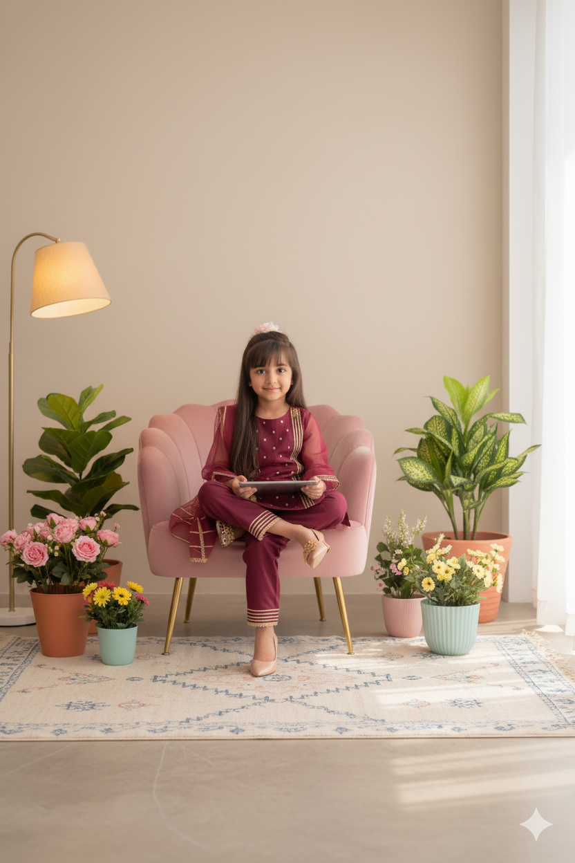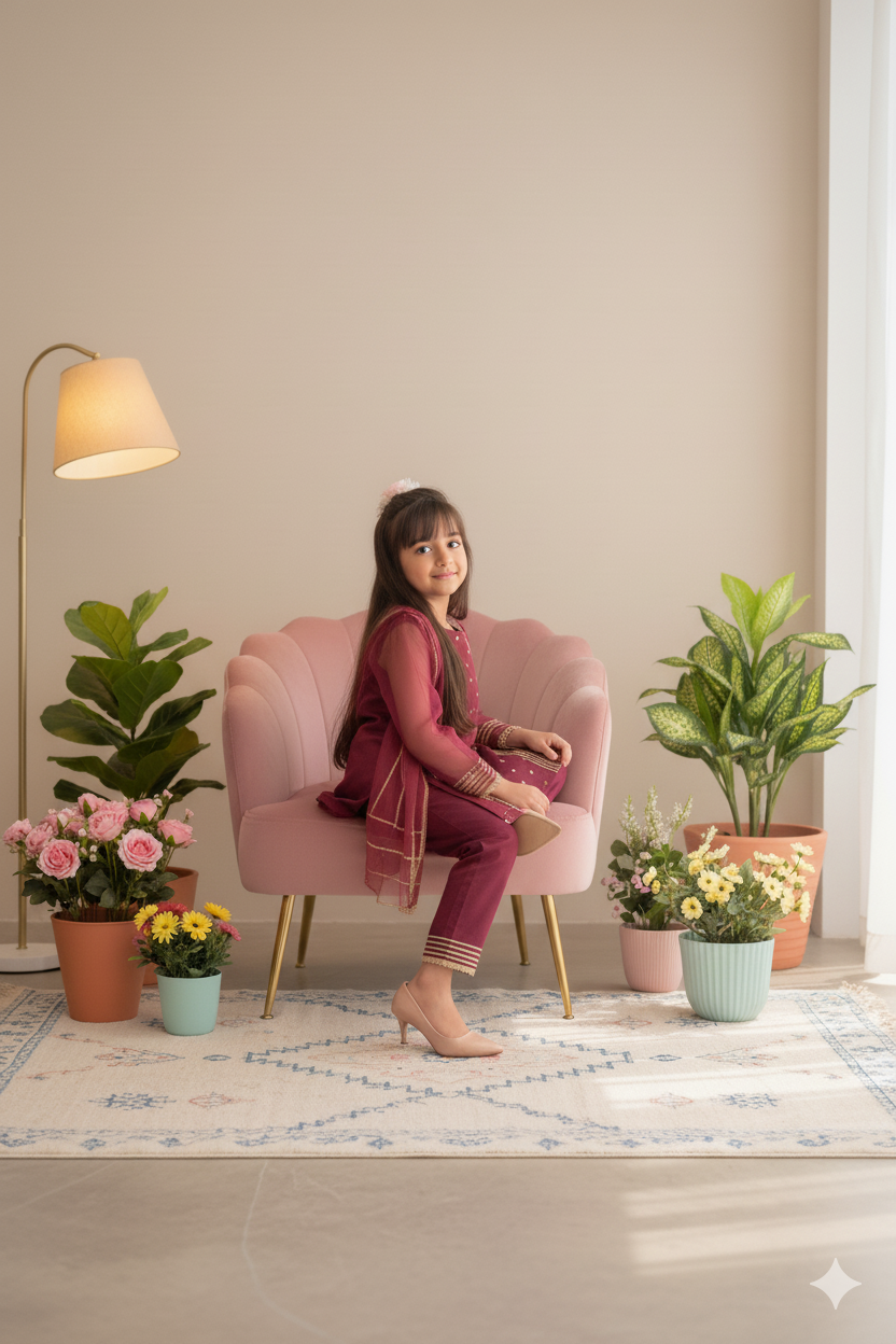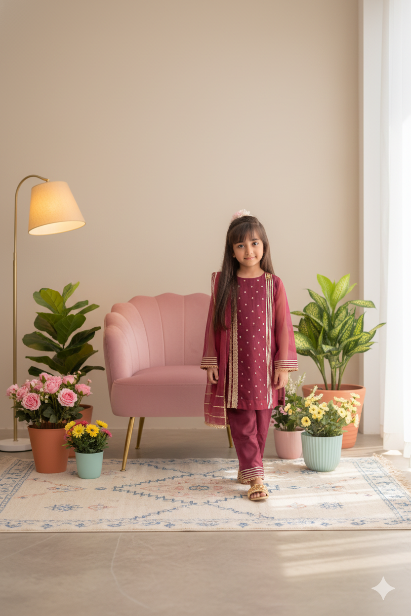 Festive Wear, Special Occasion Outfit, Party Wear, Wedding Outfit, Elegant Outfit, Stylish Festive Wear, High-Quality Festive Wear, Unique Design Outfit, 3-Piece Outfit, Lace Work, Girls' Traditional Outfit, Kids Formal Wear, Eastern Wear for Girls, Pakistani Kids Fashion.