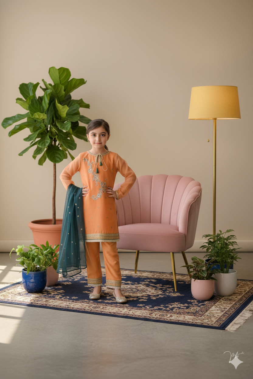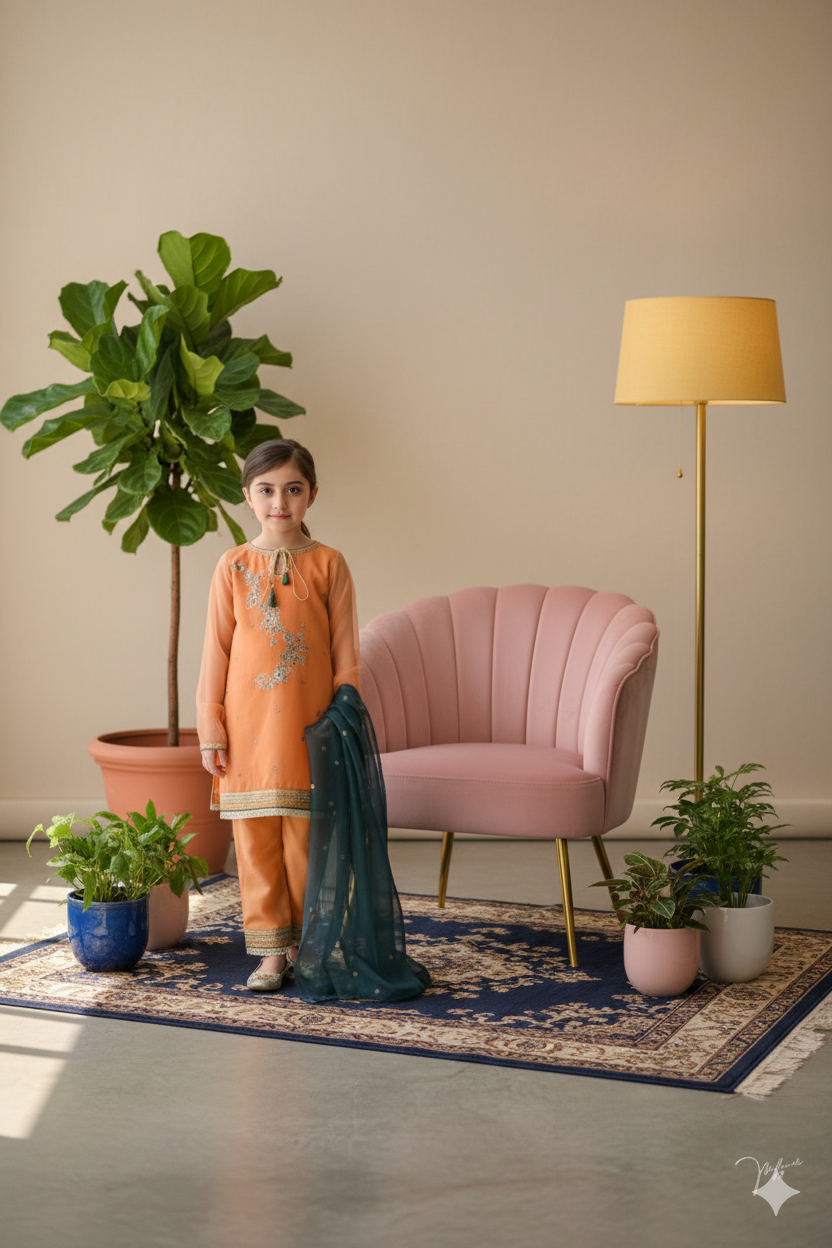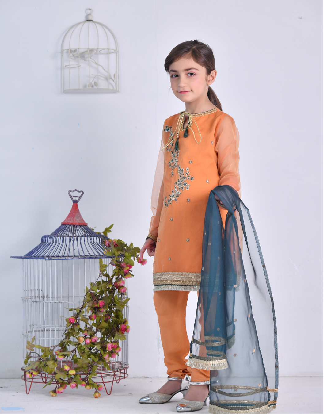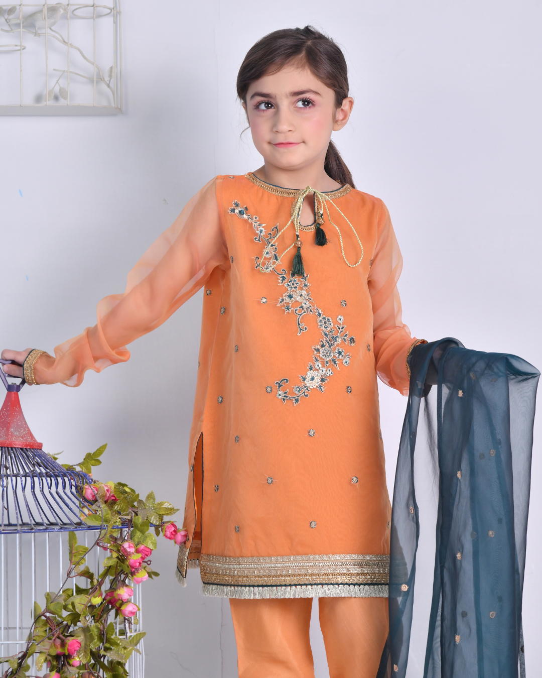 Saffron organza dress, girls 3-piece suit, organza outfit for kids, special occasion wear, girls wedding outfit, festive dress for girls, elegant kids outfit, saffron party dress, lightweight formal wear, stylish eastern dress, girls traditional wear, Pakistani fashion for girls, organza clothing kids, airy formal dress, premium kids suit.