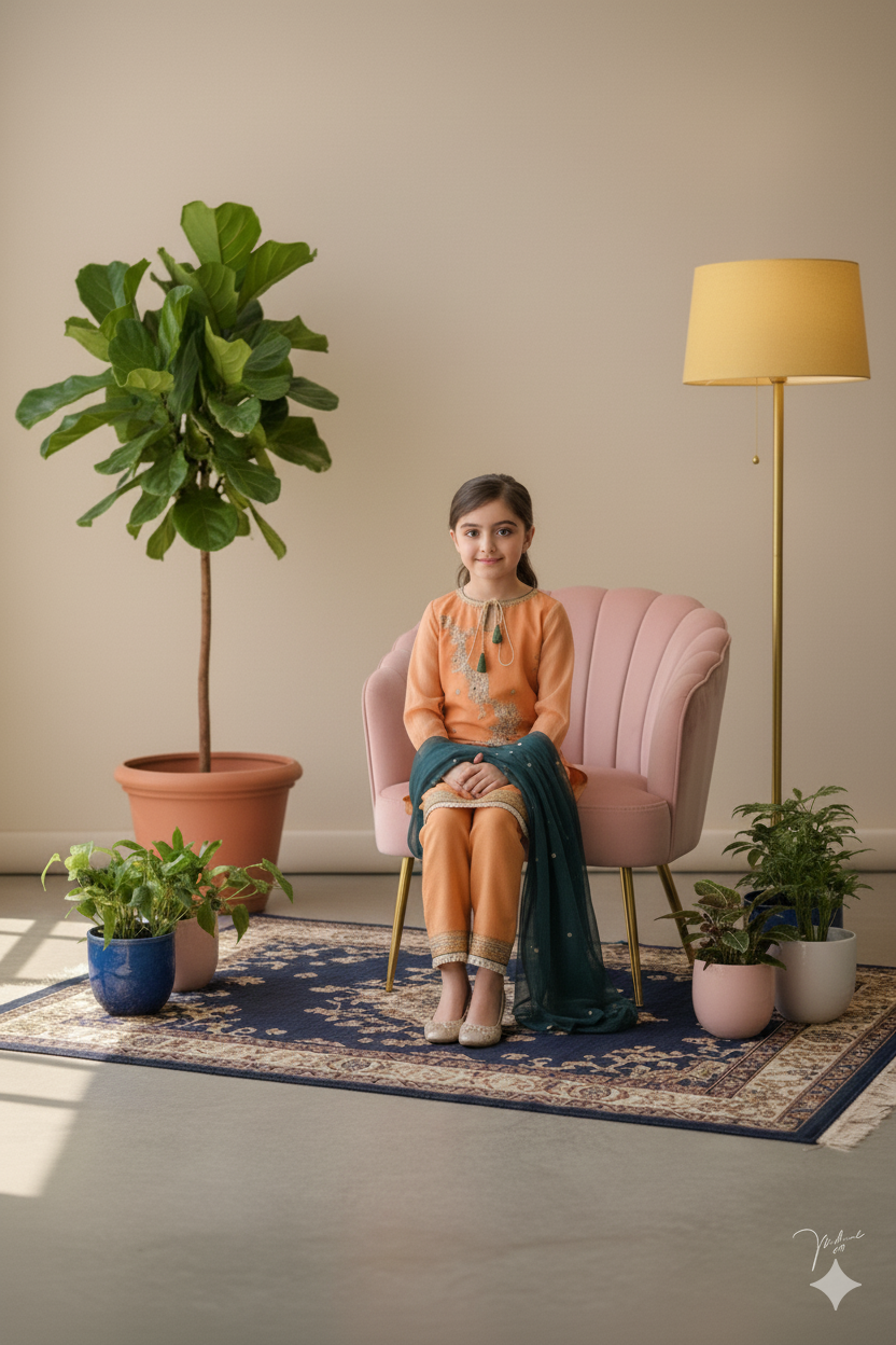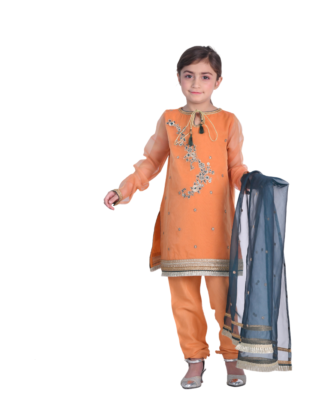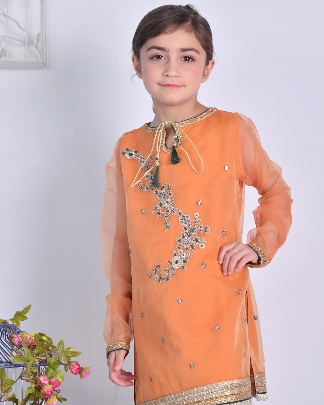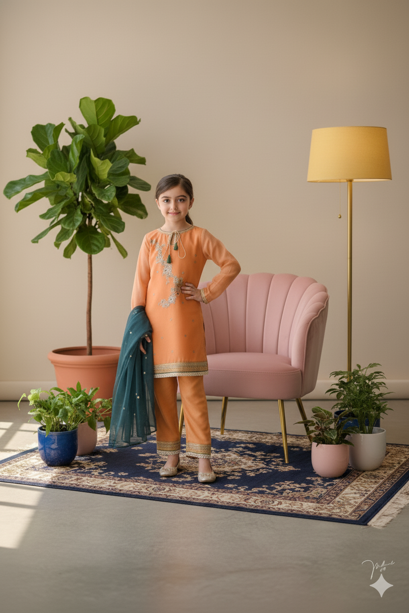 Saffron organza dress, girls 3-piece suit, organza outfit for kids, special occasion wear, girls wedding outfit, festive dress for girls, elegant kids outfit, saffron party dress, lightweight formal wear, stylish eastern dress, girls traditional wear, Pakistani fashion for girls, organza clothing kids, airy formal dress, premium kids suit.