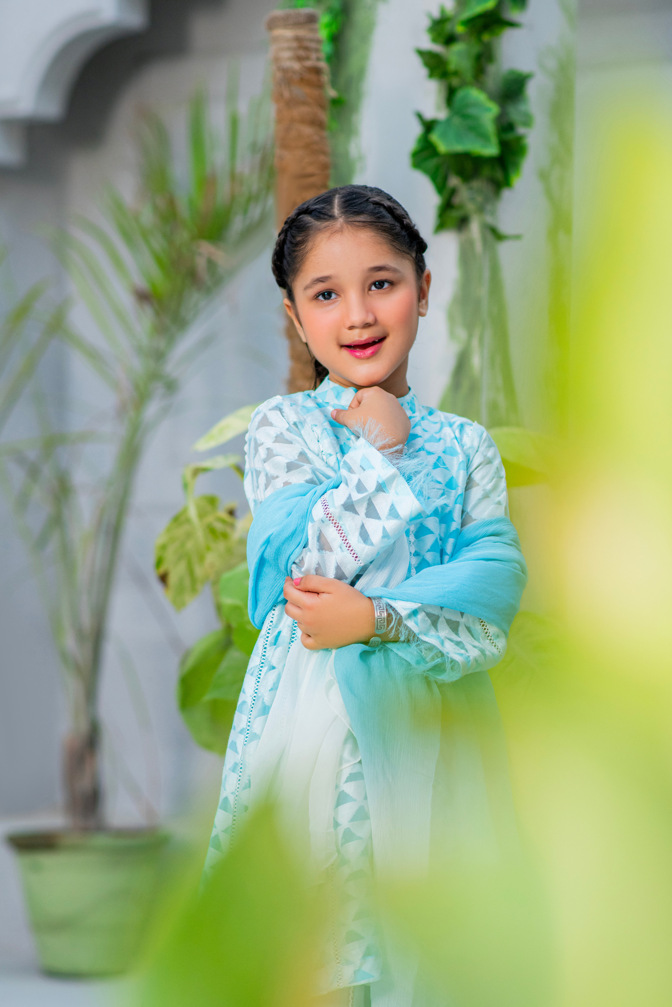 Our Premium Quality Sky Blue & White Geometric Print Suit, designed for kid girls and young teens. This elegant 3-piece ensemble features a comfortable kurta with a chic light blue and white triangular print, matching plain trousers, and a flowy dupatta. Crafted from breathable, high-quality fabric, this suit offers exceptional comfort and durability, making it perfect for daily wear, school, or any casual gathering.