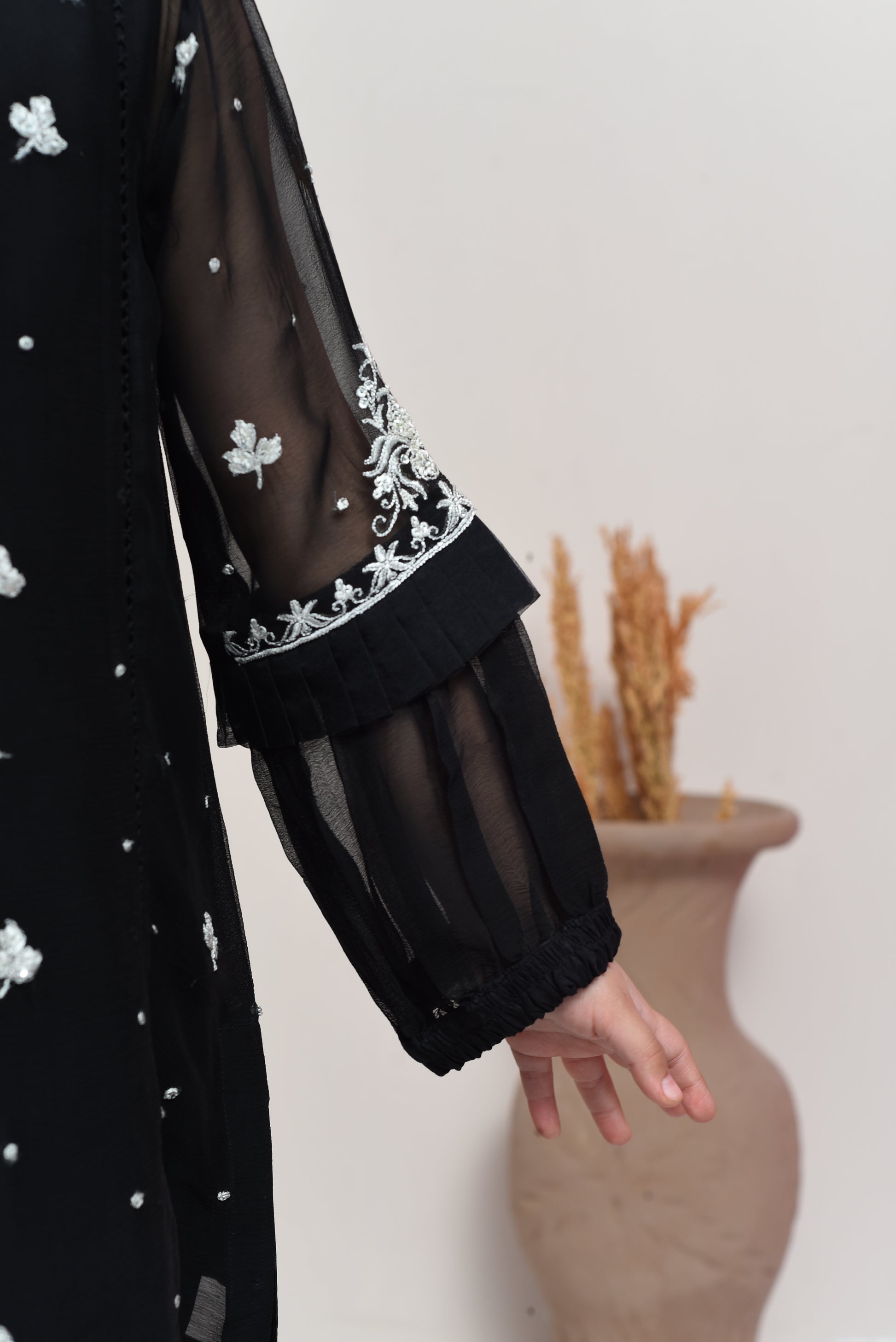 Black chiffon suit, premium quality, lightweight fabric, airy drape, sophisticated silhouette, delicate white embroidery, neckline detail, sleeves detail, hem detail, intricate charm, special occasion, refined style, effortlessly chic, wonderfully comfortable, girls wear, kids fashion, festive wear, party wear, elegant outfit.