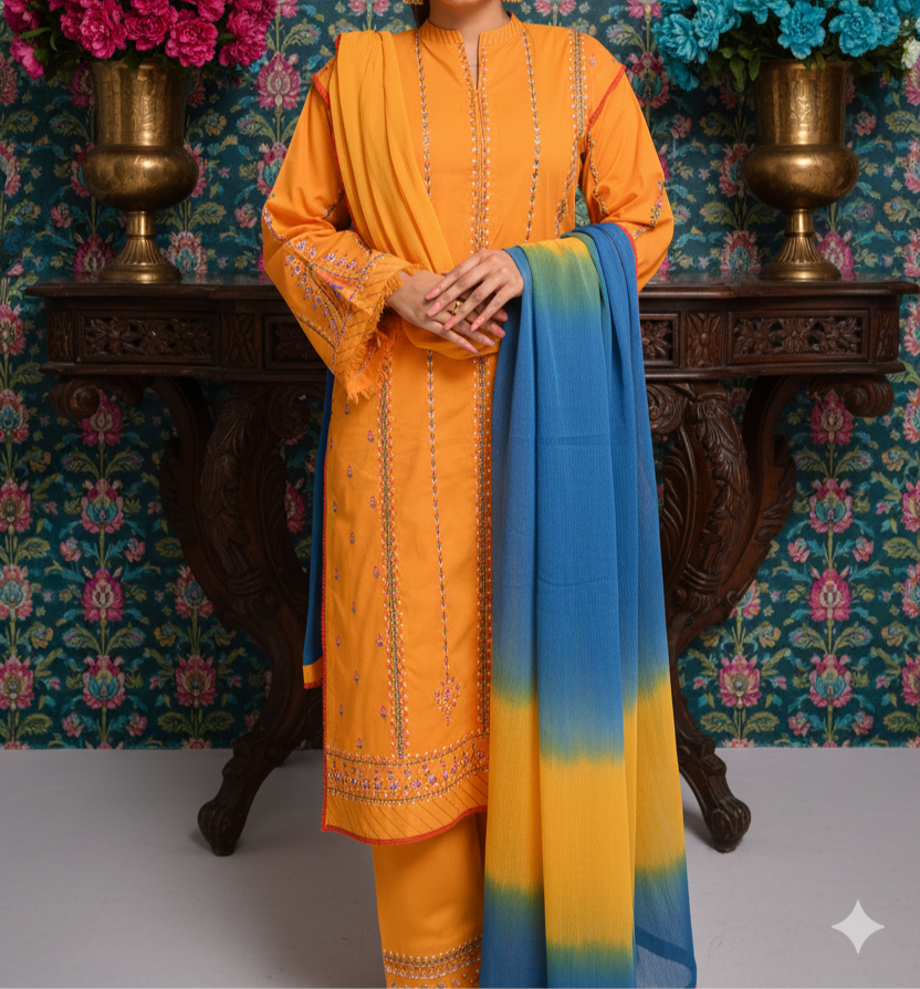 Premium Quality ! Where rich color meets exquisite detail. The intricate embroidery is seamlessly integrated into the fabric, creating a look of refined elegance. Accompanied by perfectly matched trousers and a visually striking ombré dupatta, this premium ensemble offers a harmonious blend of traditional charm and contemporary flair.