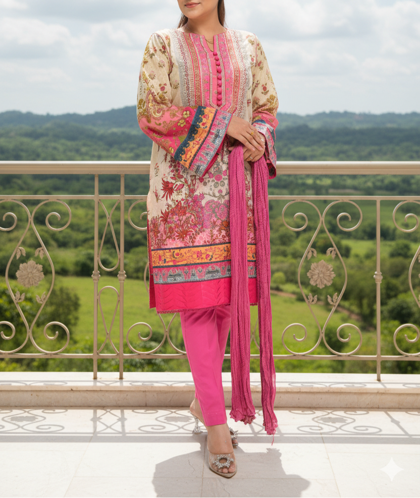 Our premium quality Pink Floral Printed two-piece lawn set offers a beautifully feminine and effortlessly stylish choice for the season. Made from soft, breathable lawn fabric, it features a delicate floral design set against soothing pink tones that exude grace and charm. Whether you're heading to a casual day out, a spring brunch, or a semi-formal event, this versatile outfit blends comfort with elegance — making it a must-have in any summer wardrobe.
