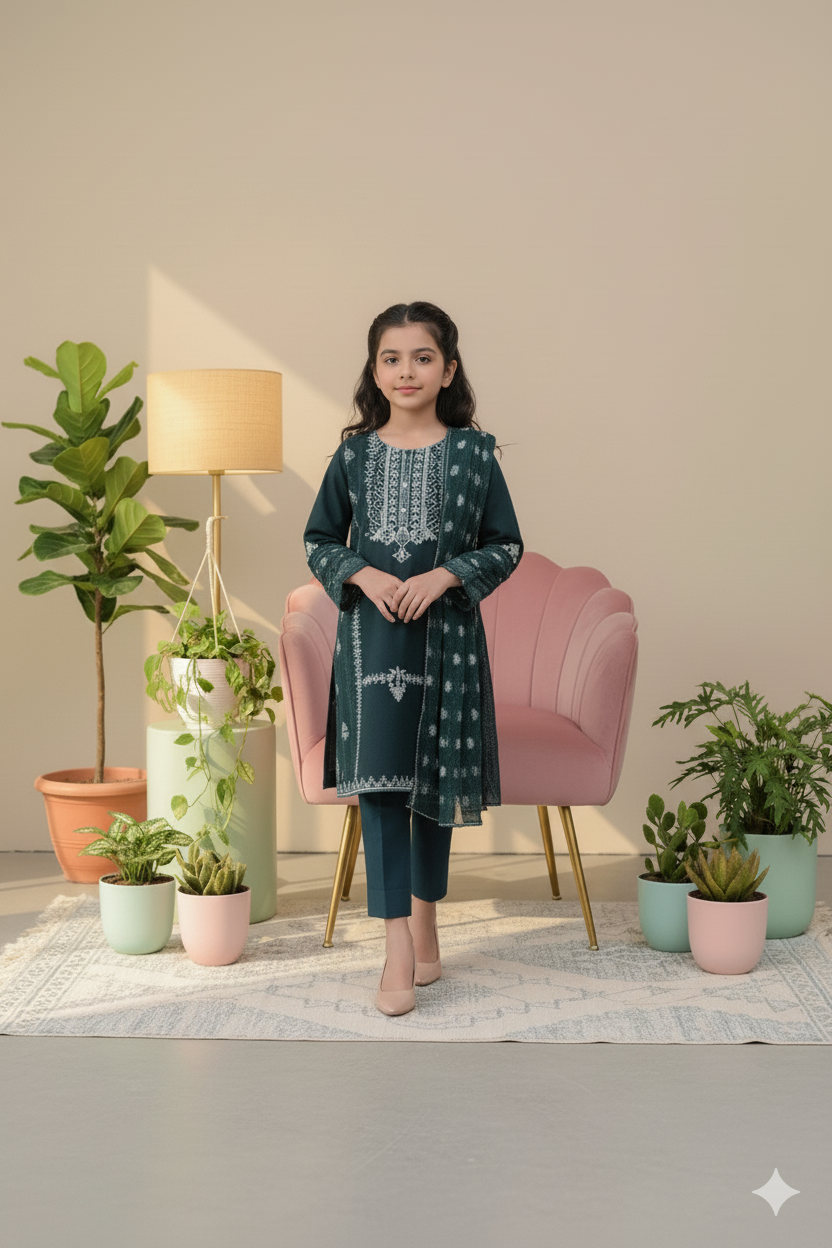 Teal green dress, Mother daughter dress, Matching outfits, Girls dress, Womens dress, Kids wear, Premium quality, Budget friendly, Embroidery, Front embroidery, Sleeves embroidery, Sea green piping, Neckline piping, Sleeves piping, Jacquard Bamber Chiffon dupatta, Pretty combination, Family outfits, Coordinated outfits, Festive wear, Elegant